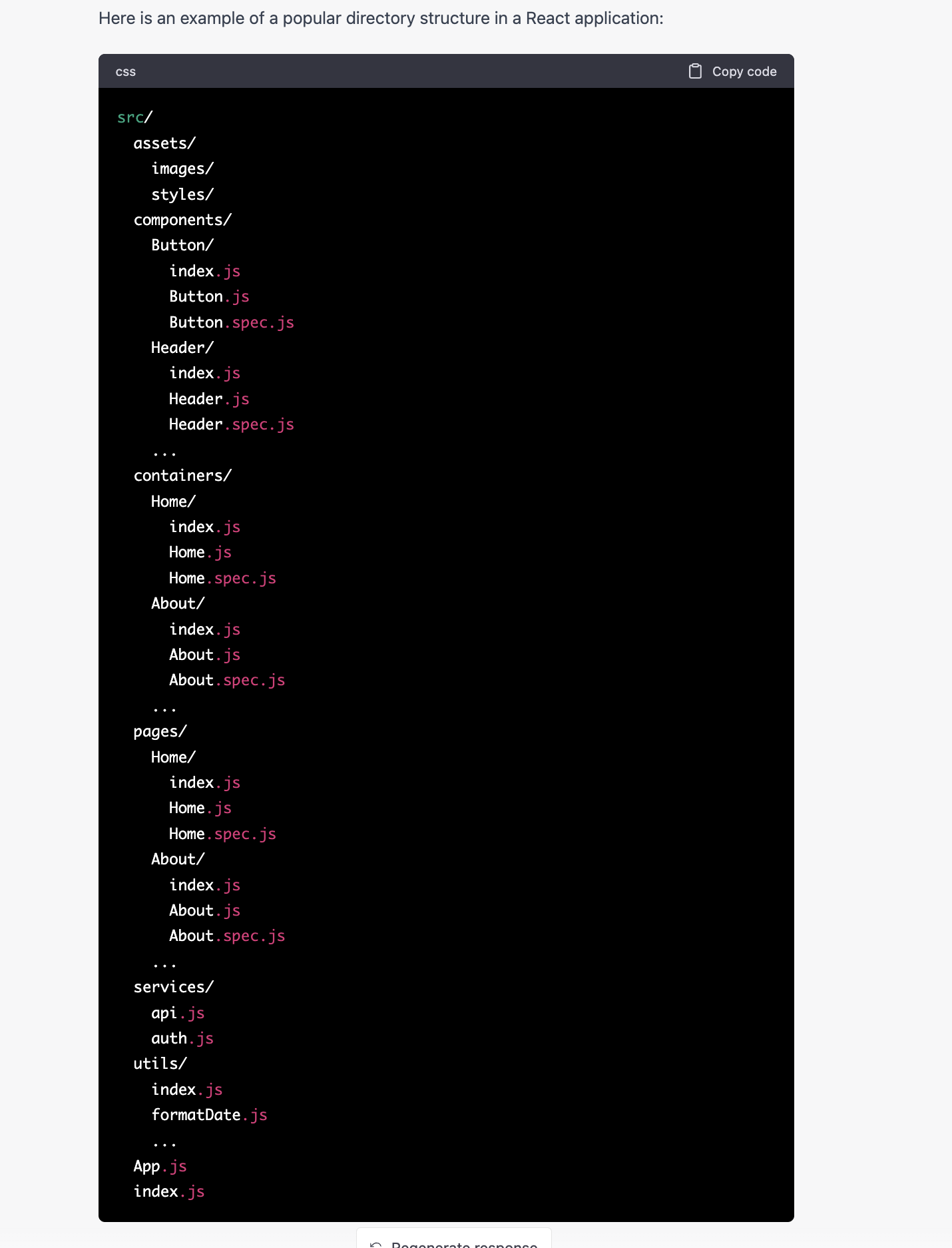 - 아래의 사진은 한국어와 영어로 "React에서 가장 많이 사용되는 폴더 구조"를 ChatGPT에 물어본 결과이다.