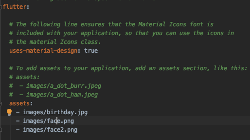 1. pubspec.yaml에 들어가 아래와 같이 flutter: 아래에 assets: 을 추가하고 아래에는 이미지의 경로 추가