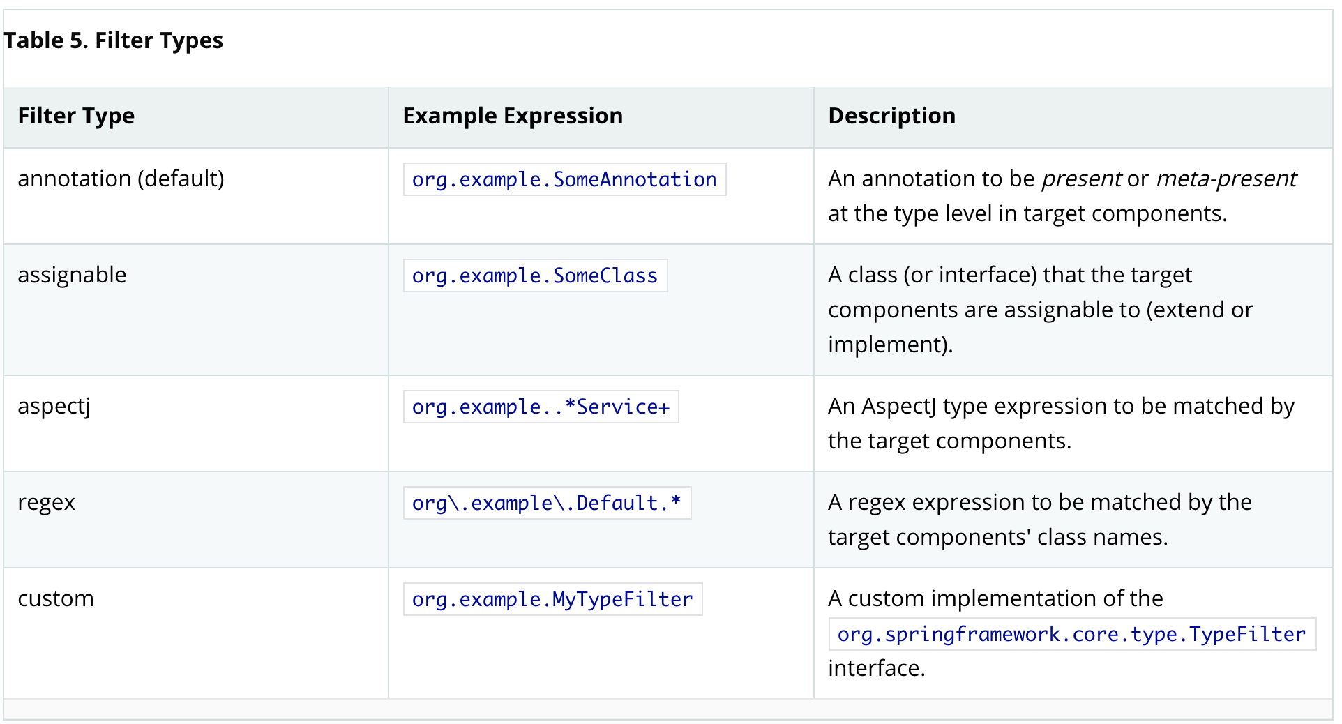3) REGEX : @ComponentScan.Filter(type = FilterType.REGEX, pattern = "kr.co.fastcampus.cli.B")