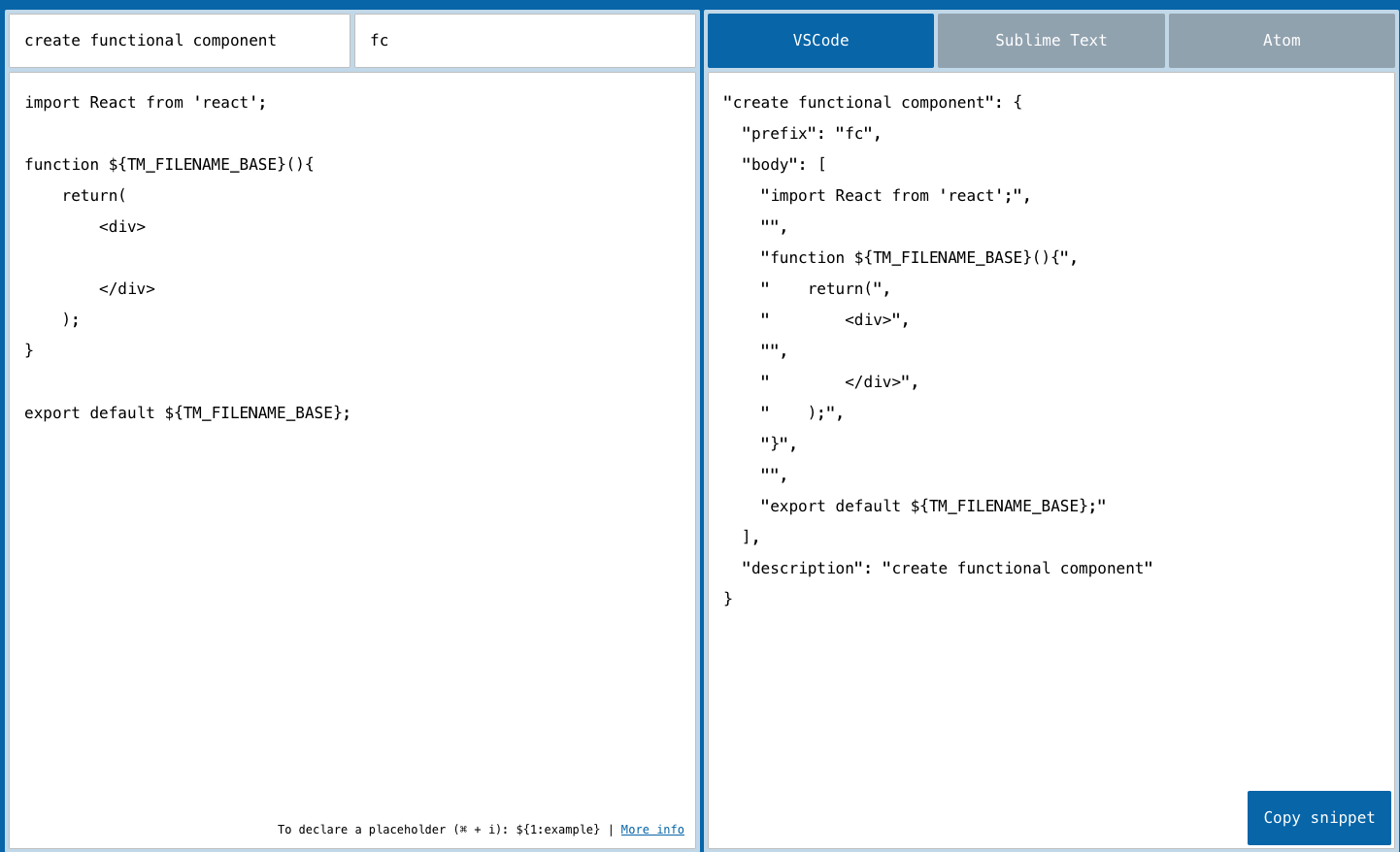 ①번에는 만드려는 Snippet의 설명 (ex. create functional component)