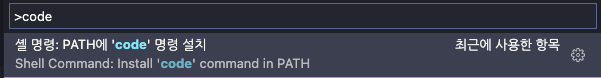 5. vscode에서 cmd + shift + p 검색창에 code를 검색하여 PATH에 'code' 명령 설치